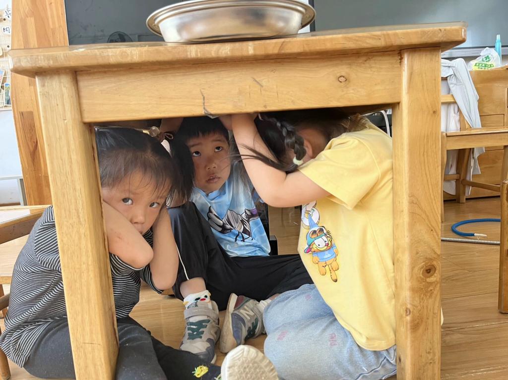 当第一次警报拉响,各班教师立即告知幼儿“地震来了,不要慌”,并指挥幼儿迅速抱头、闭眼,躲在各自的课桌下或课桌旁,尽量蜷曲身体,降低身体重心,并尽可能保护头部;最后一排幼儿面向墙,蹲在墙角处。警报第二次拉响后,老师让幼儿睁眼抬头,并告知幼儿,地震已过,现在撤离教室,进入紧急疏散演练环节。各班幼儿在教师的指挥护送下,迅速撤离至空旷地,到达指定安全位置,各教师清点人数并逐级汇报情况,活动圆满结束。
