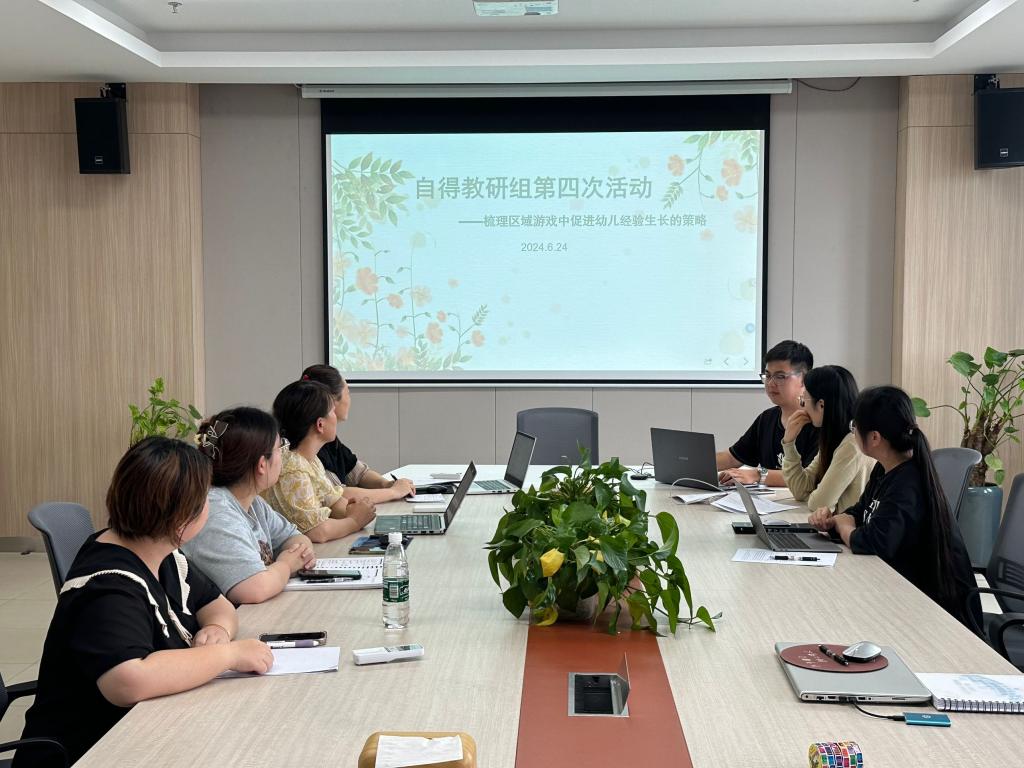 2024年6月25日上午,太仓市沙溪镇白云幼教中心利泰幼儿园“自得“教研组开展了本学期第四次教研活动:梳理成果,总结经验:区域游戏中能够促进幼儿经验生长的互动策略