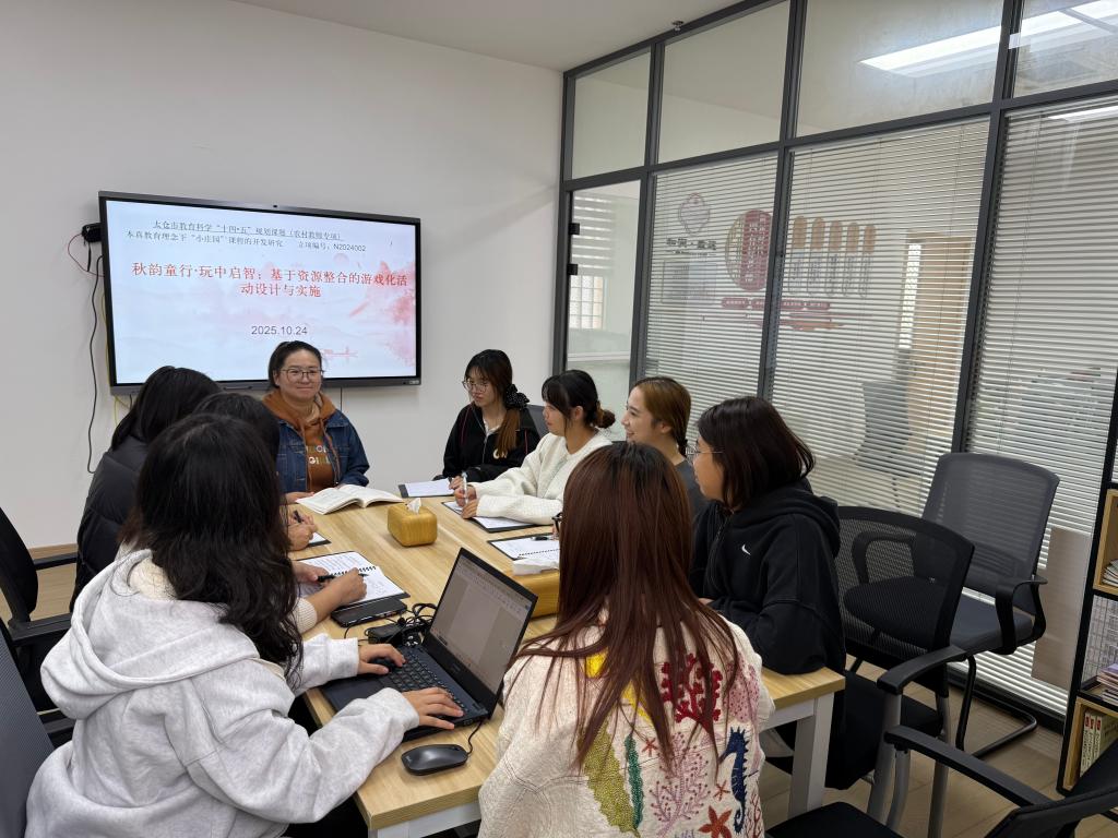 为破解幼儿秋季主题活动中跨学科目标渗透与自由探索、结构化学习平衡的实践难题,2025年10月24日,太仓市沙溪镇白云幼教中心归庄幼儿园在园内研修室开展 “秋韵童行・玩中启智 —— 基于资源整合的游戏化活动设计与实施”小庄园课题活动,课题组全体教师参与此次研讨。