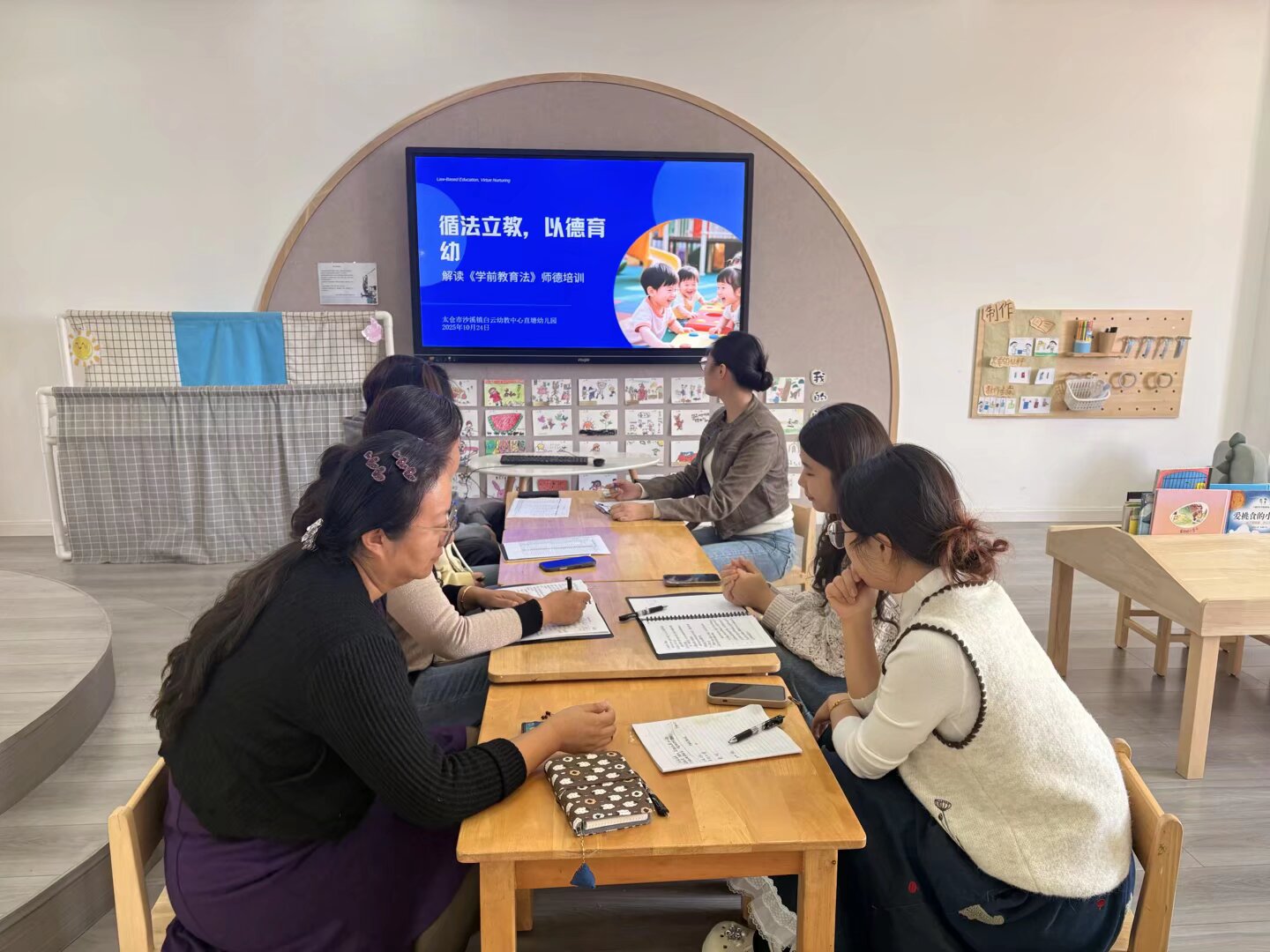 本次活动围绕《学前教育法》的核心内容展开,重点解读了第四章“保育与教育”与第五章“教师和其他工作人员”的相关条款。活动中,教师们系统学习了“以游戏为基本活动”的教育原则,明确了禁止体罚、变相体罚及歧视行为等法律底线,进一步增强了依法从教、以德立身的责任意识。在问题研训环节,教师们结合日常教学实践,就“如何落实以游戏为基本活动”“如何科学引导幼儿行为”等议题展开深入研讨,共同探索将法律精神融入课程设计与师幼互动的有效路径。为促进法律条文向教育行为的转化,幼儿园还制定了“蹲下来倾听”“积极引导”“尊重差异”“隐私保护”四项行为公约,并组织全体教师庄严宣读,承诺在日常工作中践行公约精神,营造尊重、关爱、支持幼儿成长的教育环境。